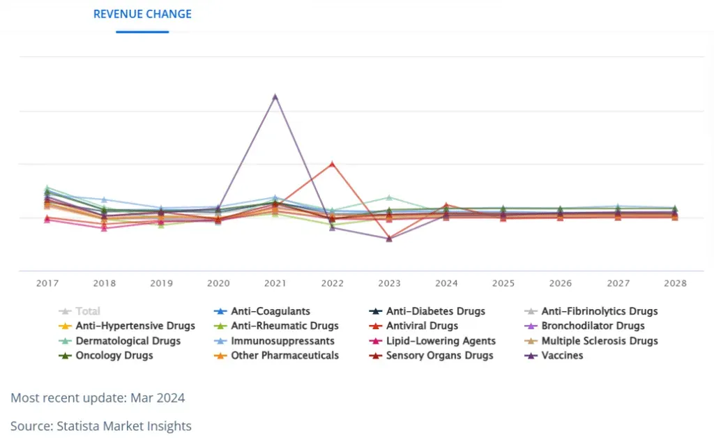 يشهد سوق الأدوية في المملكة العربية السعودية مرحلة تحول كبيرة، مع توقع وصول الإيرادات إلى 5.56 مليارات دولار أمريكي بحلول عام 2024. ومن المتوقع أن يستمر هذا النمو بوتيرة مستقرة، بمعدل نمو سنوي مركب يبلغ 6.08% بين عامي 2024 و2028، ليصل حجم السوق إلى 7.04 مليارات دولار أمريكي بحلول عام 2028. ويقدم فريقنا المتخصص في استشارات الرعاية الصحية في السعودية رؤى معمقة حول المشهد المتغير لسوق الأدوية في المملكة.