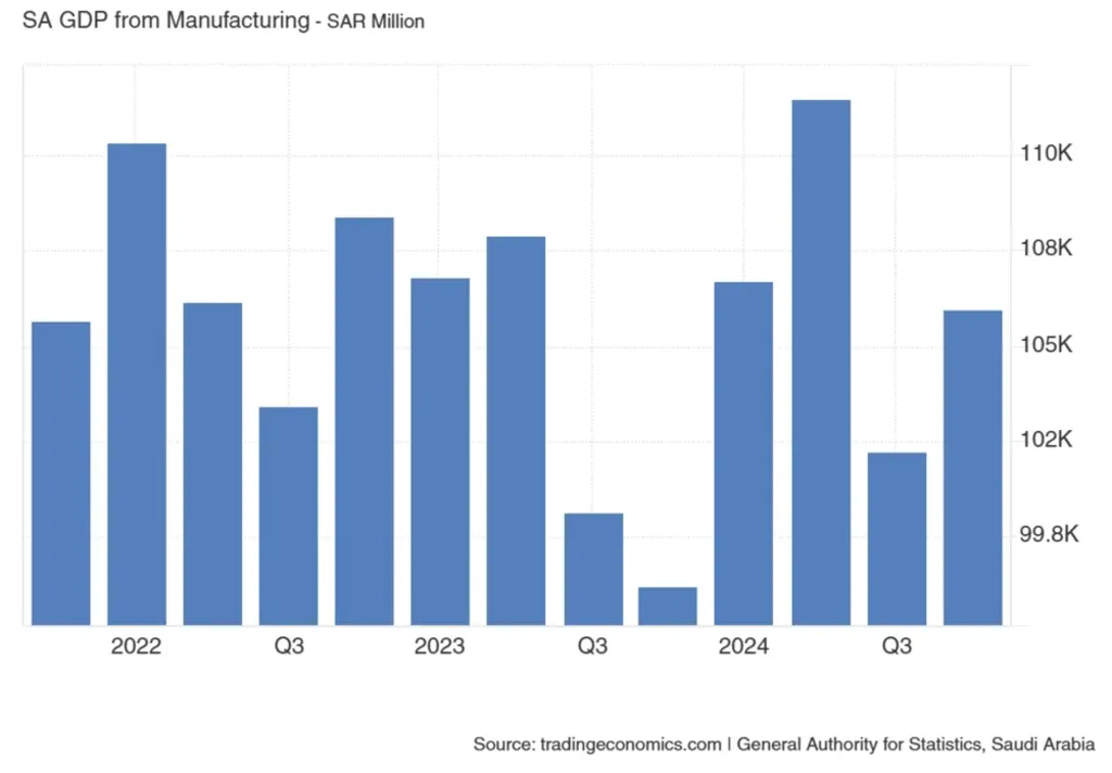 حقق قطاع التصنيع في السعودية نموًا سنويًا بنسبة 3.02% بين عامي 2023 و2024. وبلغ ذروته في الربع الثاني من عام 2024 بمبلغ 112 ألف مليون ريال سعودي (29.89 مليار دولار أمريكي)، متجاوزًا أداء الربع الثاني من عام 2023 الذي بلغ 108 ألف مليون ريال سعودي (28.83 مليار دولار أمريكي)، ليسجل بذلك أعلى أداء ربع سنوي تم رصده. وعلى الرغم من أن الربع الثالث من 2024 شهد زيادة طفيفة مقارنةً بالربع الثالث من 2023، فإن الربع الرابع من 2024 تعافى بعد التراجع الذي حدث في 2023، مما يعكس مرونة القطاع الصناعي ويشير إلى استمرار توسع التصنيع في المملكة.