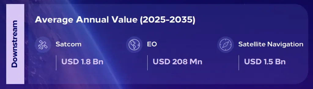 وتتصدر الاتصالات الفضائية المشهد بمتوسط سنوي يبلغ 1.8 مليار دولار، تليها خدمات الملاحة عبر الأقمار الصناعية بقيمة 1.5 مليار دولار سنويًا، في حين تسهم خدمات رصد الأرض بأكثر من 200 مليون دولار سنويًا. كما تعمل الجهات الحكومية والتجارية على توسيع نطاق استخدام الأقمار الصناعية في مجالات تشمل الدفاع، والتخطيط العمراني، والزراعة، وإدارة الكوارث. ويُسهم توسع تغطية الإنترنت المنزلي ودمج شبكات الهاتف المحمول غير الأرضية (NTN) في تعزيز الحاجة إلى مجموعات أقمار صناعية متعددة المدارات ذات جودة إشارة أعلى.
