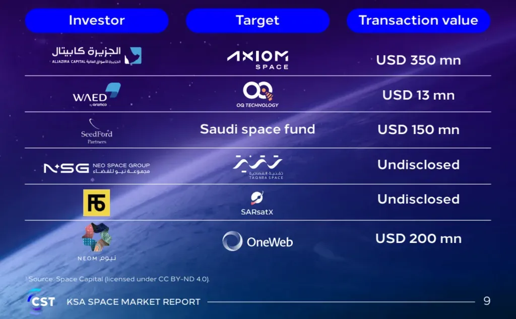 تعكس وتيرة الاستثمارات في سوق الفضاء السعودي الاتجاه العالمي نحو التوسع التجاري والتمويل القائم على الابتكار. وتشمل أبرز الصفقات جولة استثمارية بقيمة 350 مليون دولار لصالح شركة Axiom Space بقيادة الجزيرة كابيتال، واستثمارًا بقيمة 200 مليون دولار من نيوم بالشراكة مع OneWeb، إلى جانب استحواذ مجموعة NSG على شركة تقنيا ETS. وتمتد هذه الاستثمارات عبر مجالات إنترنت الأشياء الفضائي، وتحليلات رصد الأرض، وخدمات النطاق العريض، ما يعكس التوجه القوي للمملكة نحو بناء منظومة تقنية فضائية متكاملة.