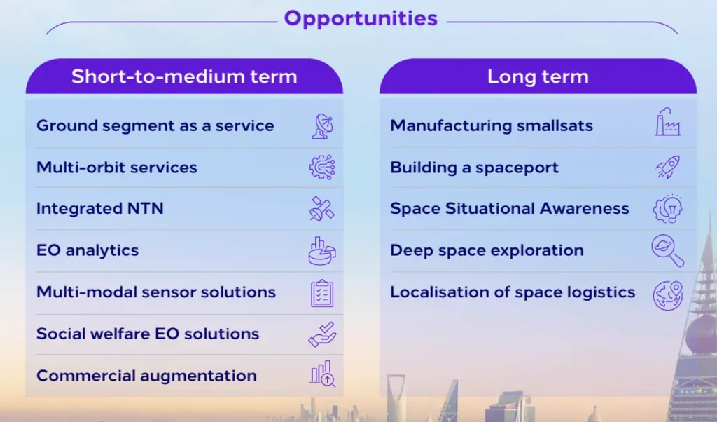 كما تسهم شركات ناشئة مثل NSG وSARsat وSpaceGuardian في تعزيز المنافسة، في حين تعمل برامج مثل “مسرّع الفضاء السعودي” ومبادرات هيئة الاتصالات والفضاء والتقنية وجامعة الملك عبدالله للعلوم والتقنية (كاوست) على تنمية المواهب ودعم ريادة الأعمال. ويسهم الإطار التنظيمي والمؤسسي، عبر هيئة الاتصالات والفضاء والتقنية، ووكالة الفضاء السعودية، والمجلس الأعلى للفضاء، في تعزيز ثقة المستثمرين واستدامة النمو.