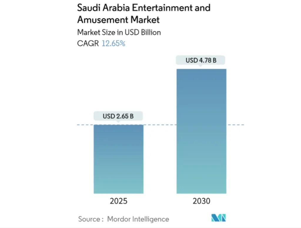 The Saudi Entertainment Market is standing at the edge of a remarkable transformation. Analysts project the industry will reach USD 2.65 billion in 2025, before nearly doubling to USD 4.78 billion by 2030. While the 2025 number is still a forecast, since the year has not yet concluded; it reflects strong momentum already visible in government-backed projects, domestic tourism campaigns, and new entertainment hubs. With a 12.54% CAGR expected through 2030, the sector is on track to become one of the Kingdom’s most dynamic growth stories.