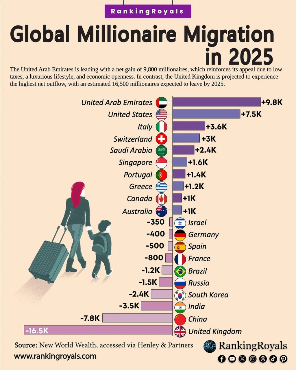 Saudi Arabia already hosts 58,300 millionaires, including 195 centi-millionaires, a figure that has risen 32% since 2013. What makes this surge historic is momentum. Henley & Partners forecasts 2,400 millionaires relocating to Saudi Arabia in 2025, up from just 300 in 2024 — an eightfold jump and the fastest growth rate globally.